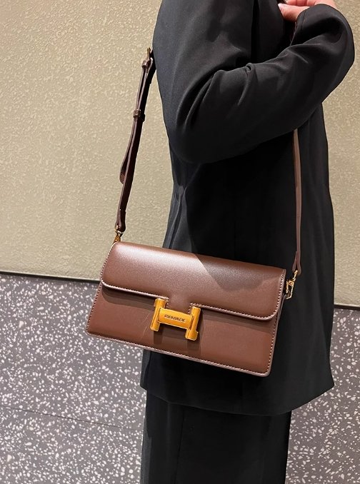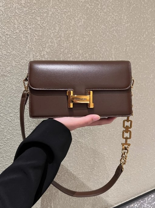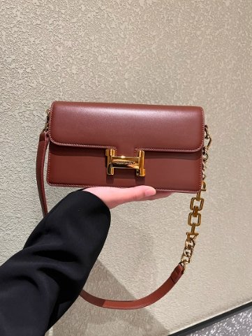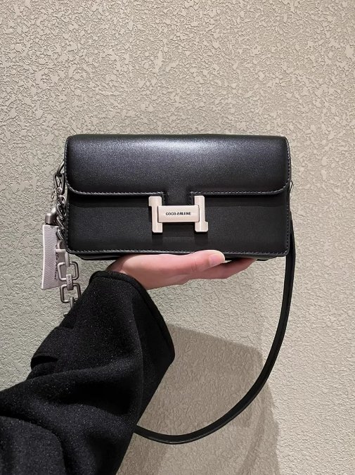 這款包包堪稱近年時尚力作,渾身散發著高級氣息。包身選用優質牛皮,黑色皮革質地細膩,光澤柔和,彰顯出不凡的品質與奢華感。 方正的小方包造型簡約大氣,搭配個性的金屬 “H” 型鎖扣,上面刻有品牌字樣,精致又醒目,成為包包的視覺亮點,增添了幾分復古韻味。金屬鏈條與皮質肩帶的巧妙搭配,既滿足了腋下包的輕巧隨性,又能斜跨背攜,方便實用,適配不同穿搭與場合。 其輕奢風格不彰自顯,無論是搭配職場套裝展現專業氣場,還是搭配休閒裙裝營造時尚氛圍,都能輕松駕馭,是追求品味的女士們不容錯過的時尚單品。