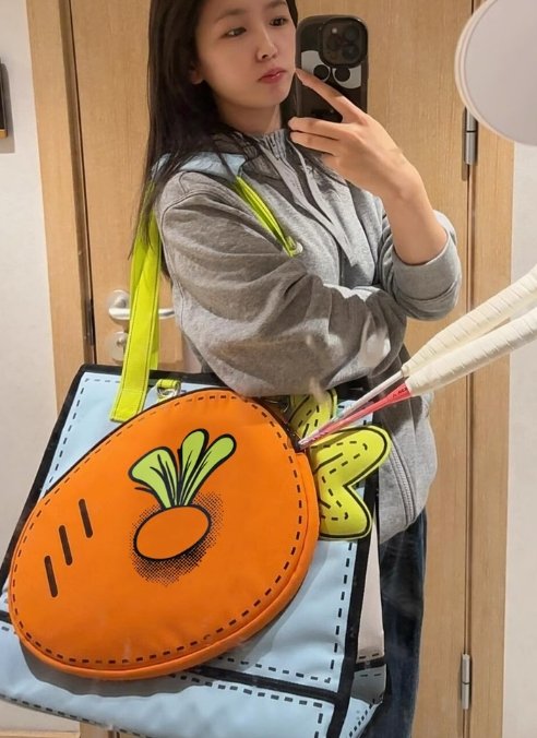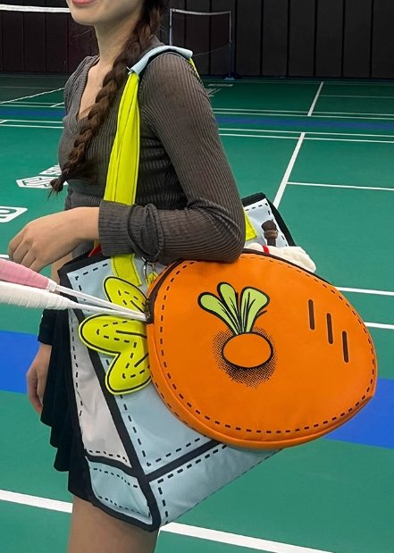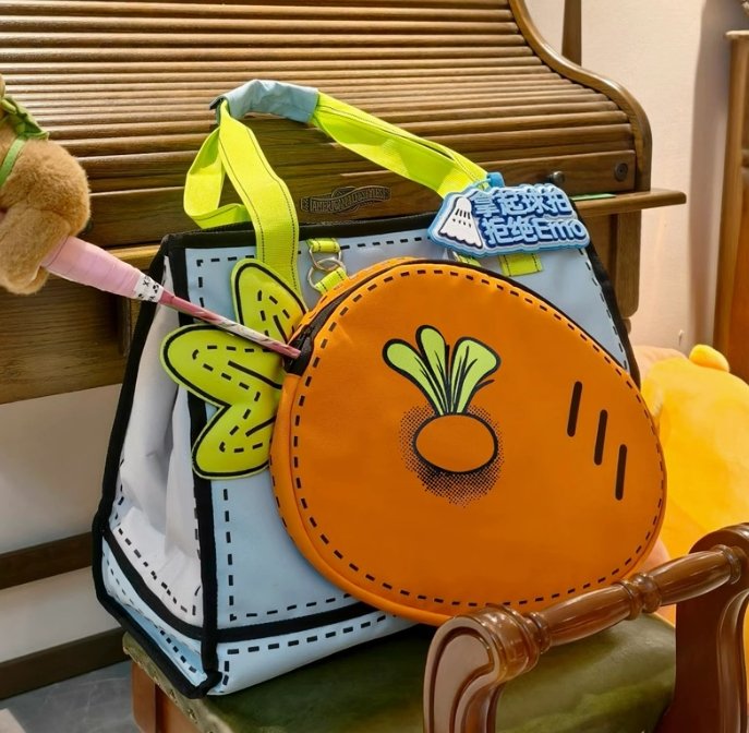 這款托特包是獨具匠心的原創小眾設計。以可愛蘿蔔為主題元素,橙色的包身搭配綠色的蘿蔔葉圖案,生動形象,俏皮感十足。包身主體部分採用藍白配色,輔以黑色縫線裝飾,勾勒出簡約時尚的輪廓。