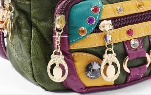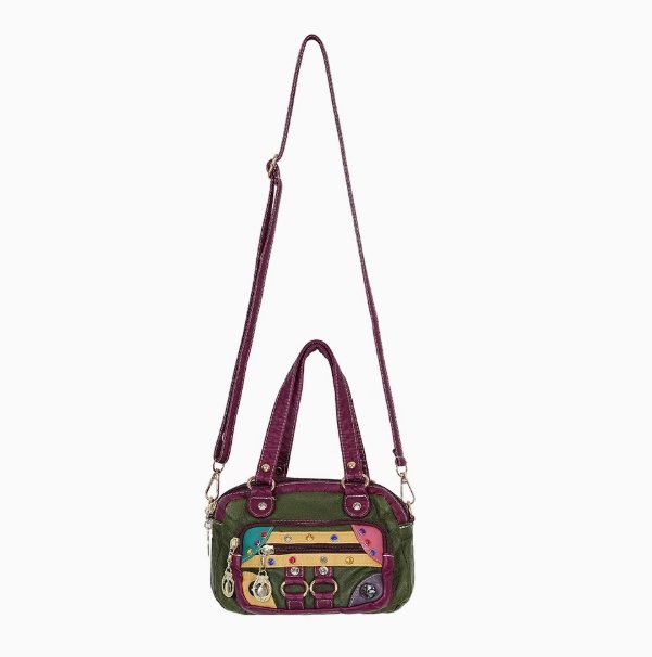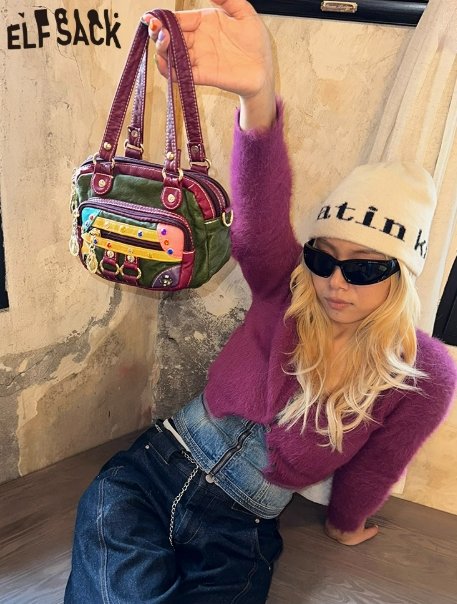 這款妖精的口袋年新款女包,將復古與個性完美融合。包身採用軟皮材質,手感柔軟且富有質感。復古撞色設計尤為吸睛,綠色主色調搭配多彩拼接區域,再加上深紫色的皮革飾邊及手柄,色彩碰撞出獨特的時尚火花。