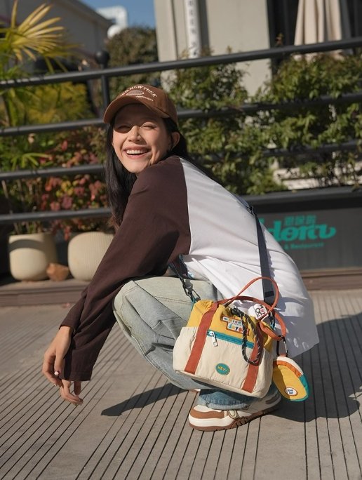 它具備手提與斜挎兩種背攜方式,手提柄部分是銀色金屬材質,堅固耐用且造型精美;可調節的黑色肩帶方便又實用。包身正面的拉鏈口袋以及搭配的小掛包,增加了收納空間,方便分類存放小物件。整體便攜性佳,無論是休閒出遊還是日常通勤,都能輕鬆滿足收納需求,是兼具美觀與實用的時尚單品。