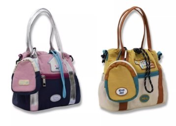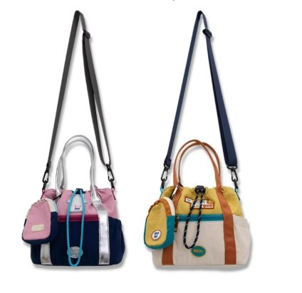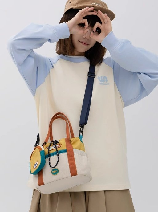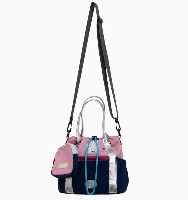 若素良品2025新款水桶布包 這款若素良品2025年新款水桶布包,洋溢著俏皮可愛的風格。包身採用撞色設計,粉色與藏藍色的搭配活力滿滿,再加上銀色的裝飾條,時尚感十足。