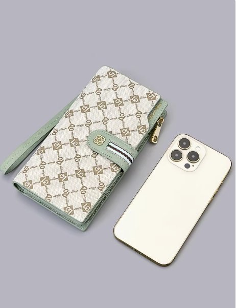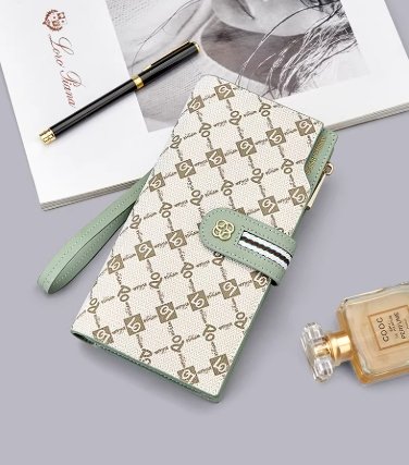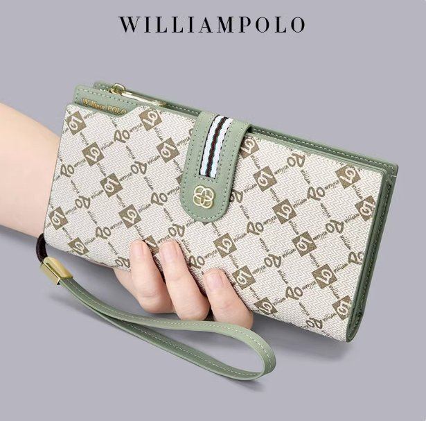 這款WILLIAMPOLO品牌的女士長款錢包,設計精美且實用,非常適合追求時尚與品質的女性。錢包採用經典的花紋圖案,搭配清新的綠色調,展現出獨特的風格。它不僅是一個錢包,還可以作為手拿包使用,一包多用,非常便利。