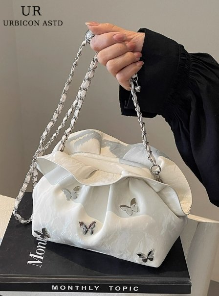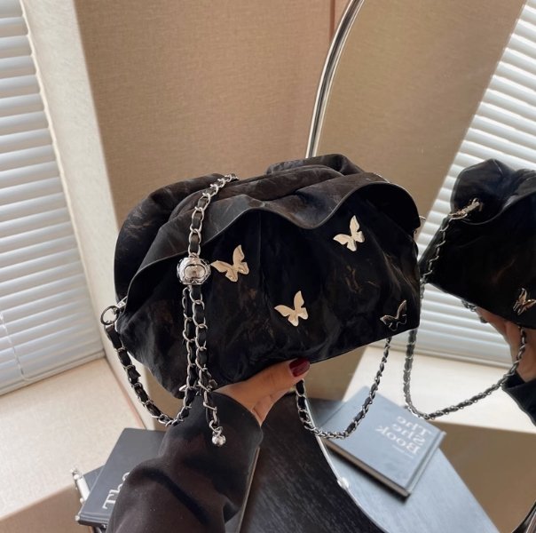 展現您的時尚品味,這款黑色蝴蝶裝飾鏈條雲朵包是您不可或缺的配件。以柔軟的材質和獨特的雲朵造型,搭配精緻的蝴蝶裝飾,這款包包散發著一種優雅且個性化的氣息,讓您在任何場合都能成為焦點。