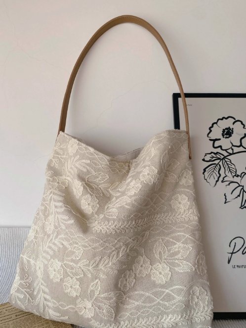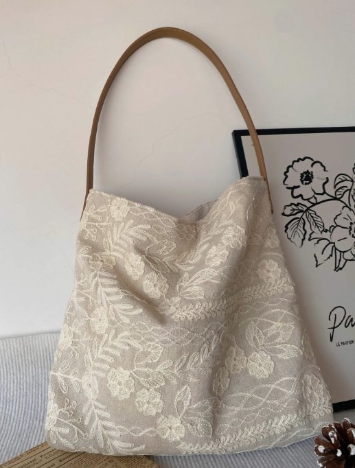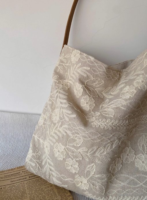 菜市場的貓原創亞麻花朵繡花單肩腋下包高級感小眾設計托特包清新