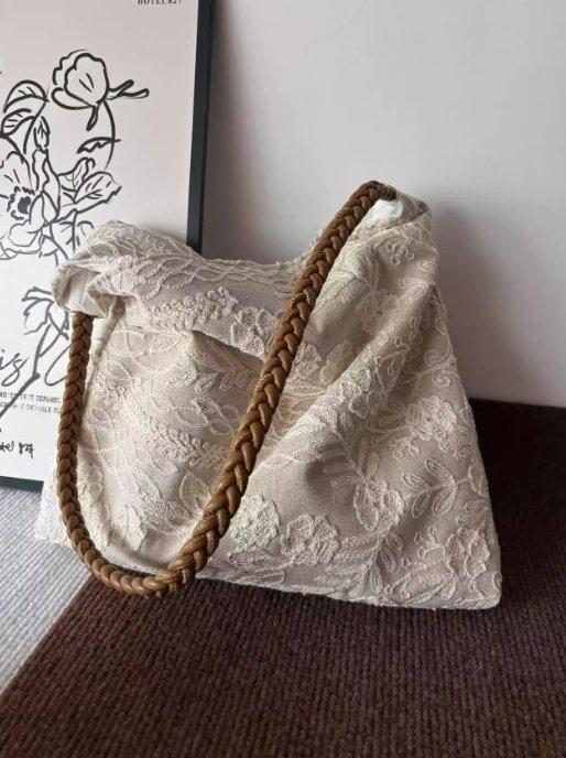 粗獷的棕色編織手柄是一大亮點,與精緻蕾絲形成反差,增添了幾分休閑與率性。它可作為單肩腋下包使用,容量適中,能輕鬆容納日常小物,如手機、錢包、口紅等。