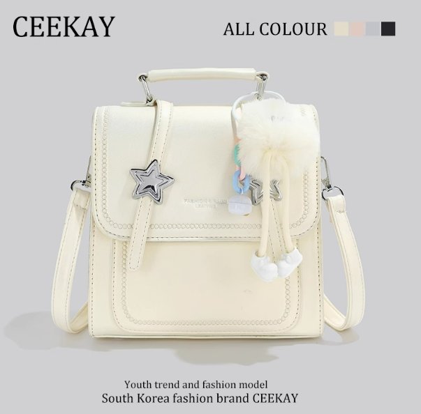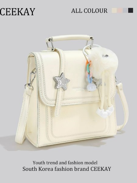 包正面的金屬星星裝飾亮眼吸睛,搭配俏皮的毛絨掛飾,掛飾上的星星與小物件,增添可愛氛圍。精緻縫線勾勒包身輪廓,提升整體精緻度。手提柄與雙肩背帶可靈活切換使用方式,背帶寬度合適,背負舒適。