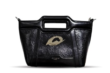 包正面鑲嵌的金色品牌標誌,是整個包的視覺亮點,在黑色包身的襯托下熠熠生輝,巧妙融合奢華與時尚元素。頂部的手提設計別具匠心,採用黑色亮面皮革打造,中間的矩形提手孔不僅方便手提攜帶,還讓包的外觀更具現代感與個性。